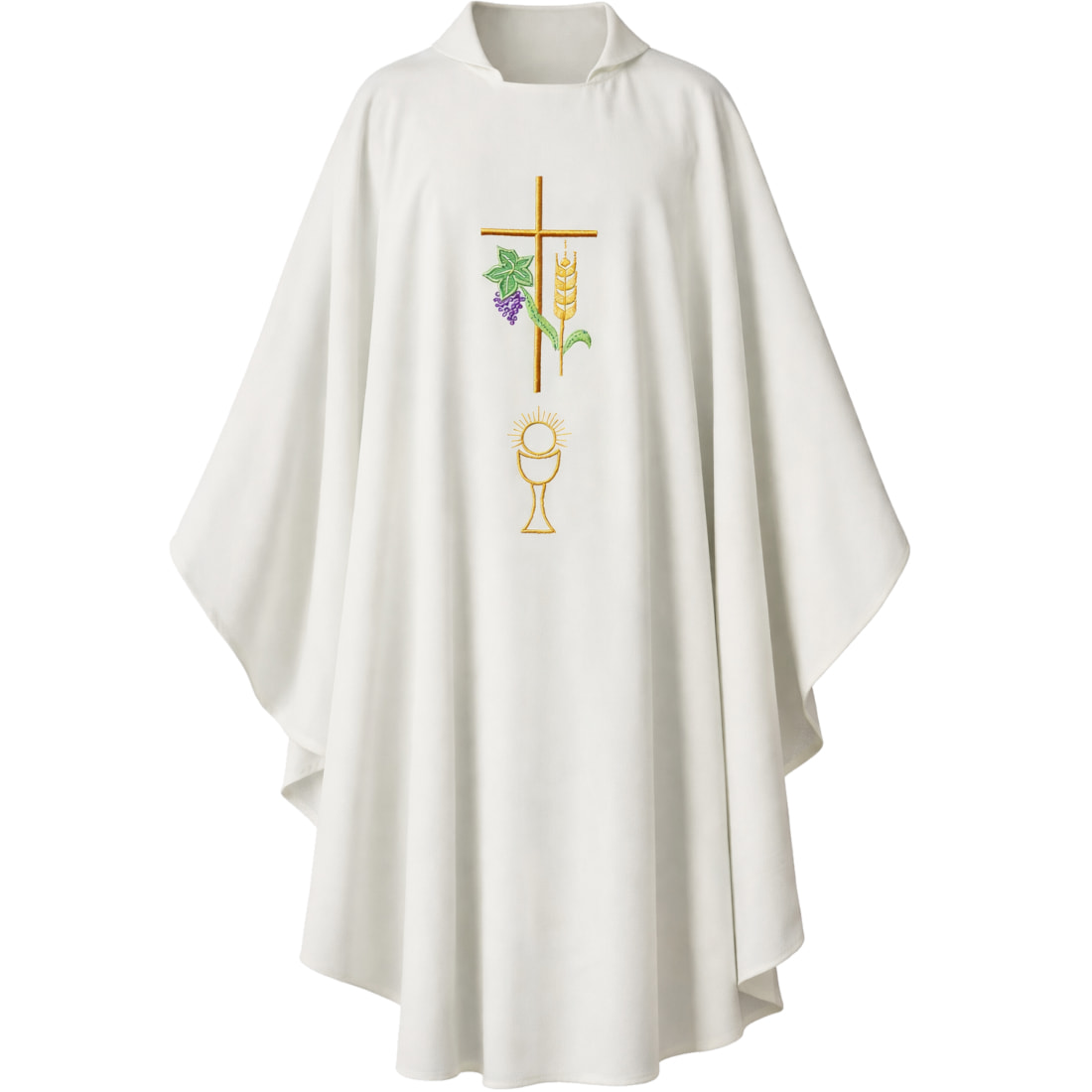 White embroidered chasuble with cross, chalice and spike