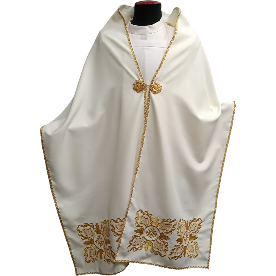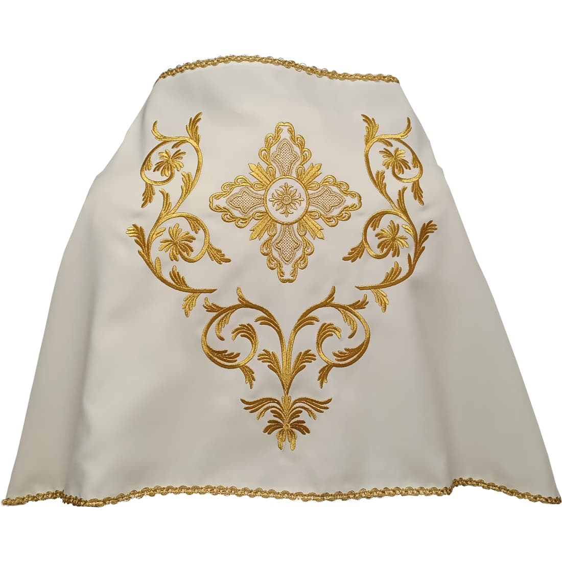 The humeral veil is a priestly shoulder cloth that is placed over the shoulders and the back of the celebrant to cover the hands when carrying the Blessed Sacrament, and in other liturgical celebrations. Made of polyester and embroidered in gold thread, it is fastened with a front closure and keeps the garment stable during blessings and processions.
