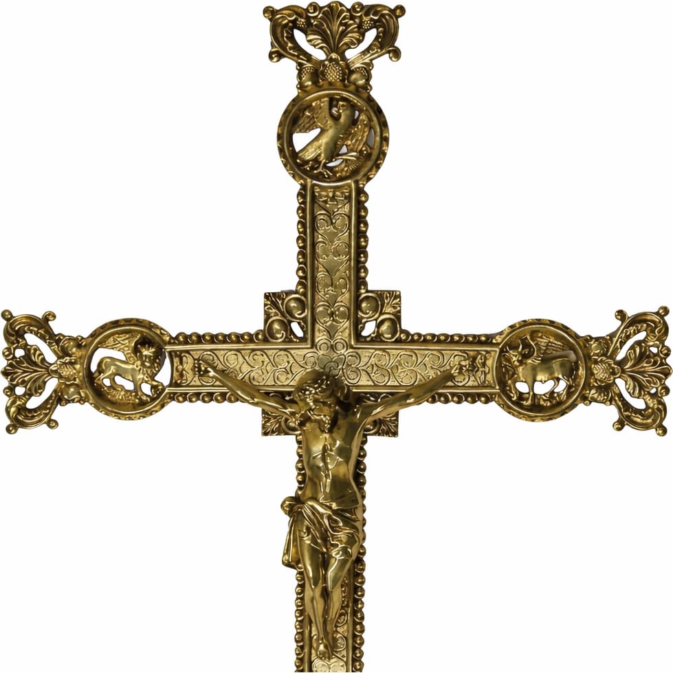 - Parish cross decorated with liturgical elements in relief.